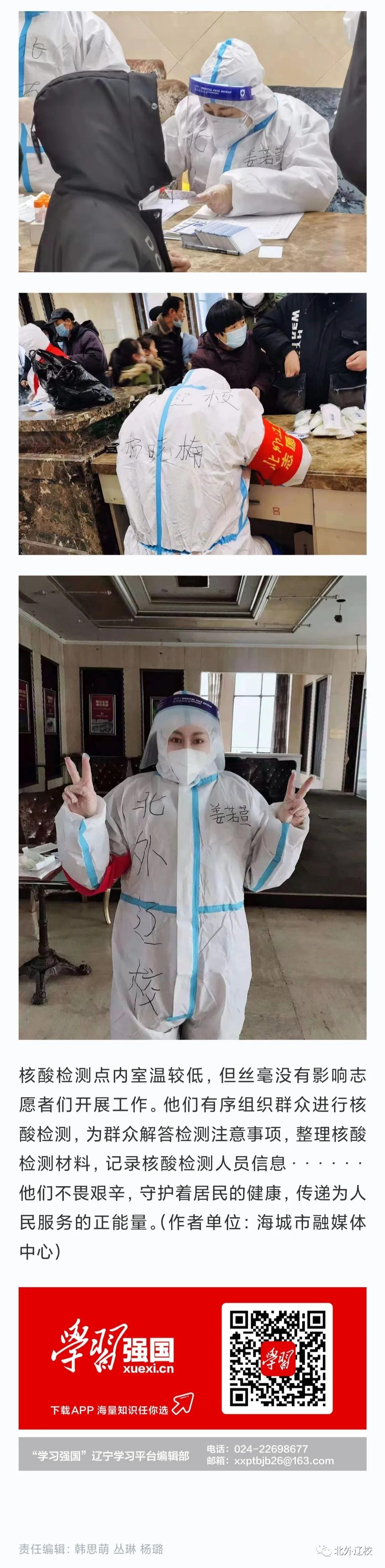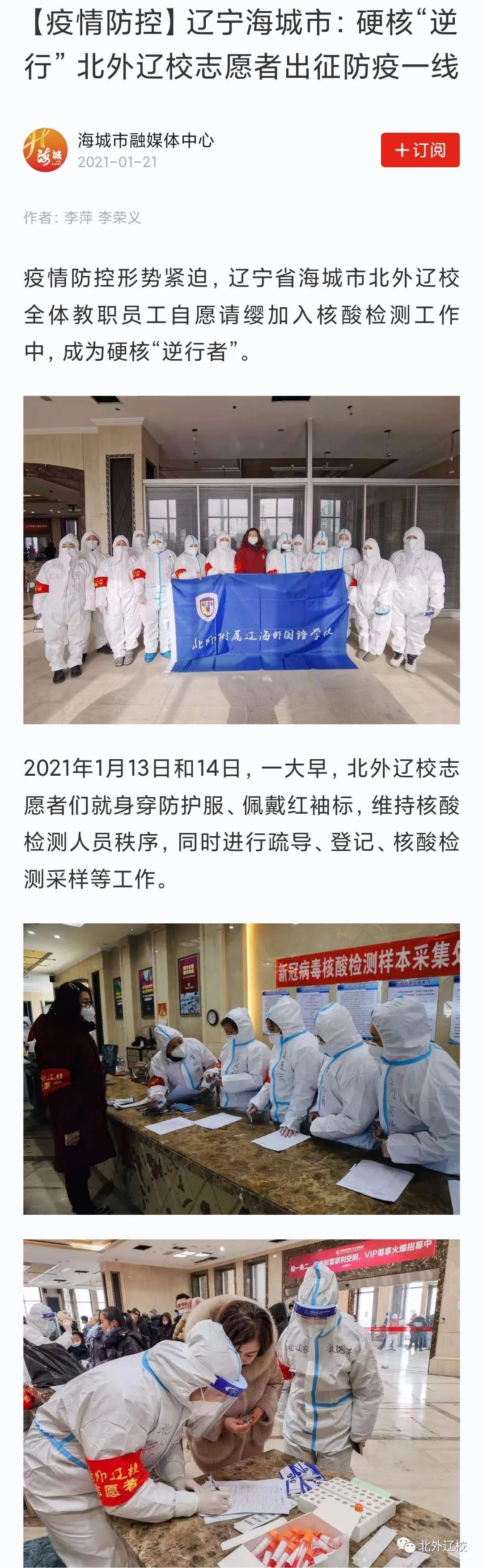 2021年1月13日至14日,由优秀党员、优秀团员和年轻骨干教师组成的北外辽校首批抗疫志愿者,面对疫情义无反顾出征海城全民核酸检测第一线,冒着危险、共克时艰、阻击疫情、硬核逆行!
