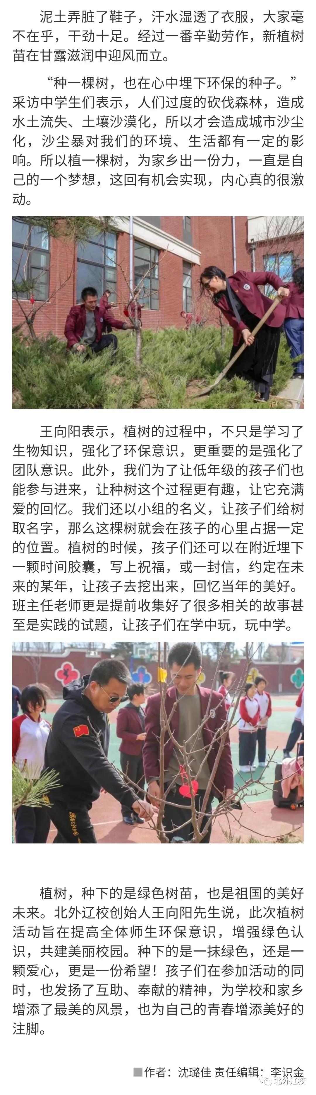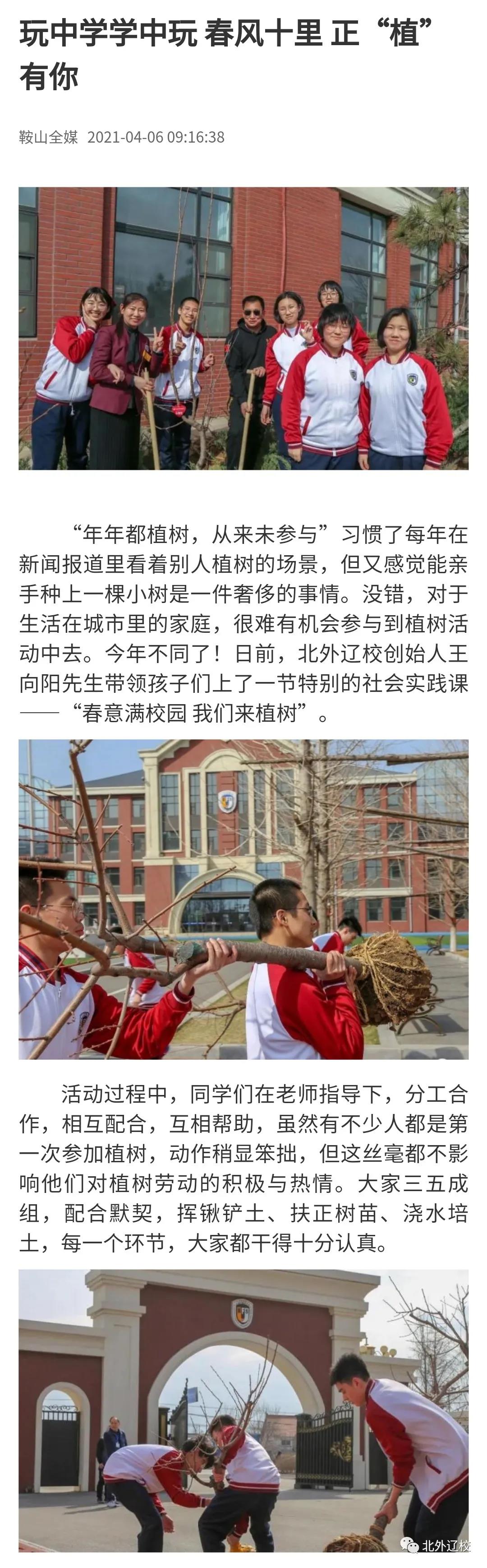 为提高全体师生环保意识,增强绿色认识,共建美丽校园。北外辽校创始人王向阳先生带领师生代表一起在校园植树,受到了鞍山市新闻传媒中心关注,他们推送新闻《玩中学学中玩 春风十里 正“植”有你 》,为北外辽校带领师生植树点赞!