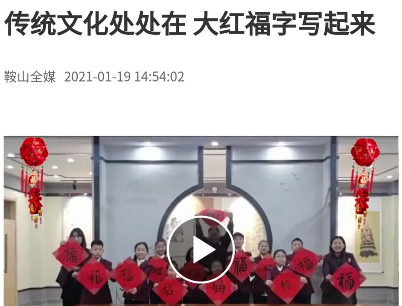【媒体关注】写福字 送祝福 鞍山市新闻传媒中心点赞北外辽校 传统文化处处在,大红福字写起来。 2021年1月19日,鞍山市新闻传媒中心旗下的鞍山云APP发表文 章《传统文化处处在 大红