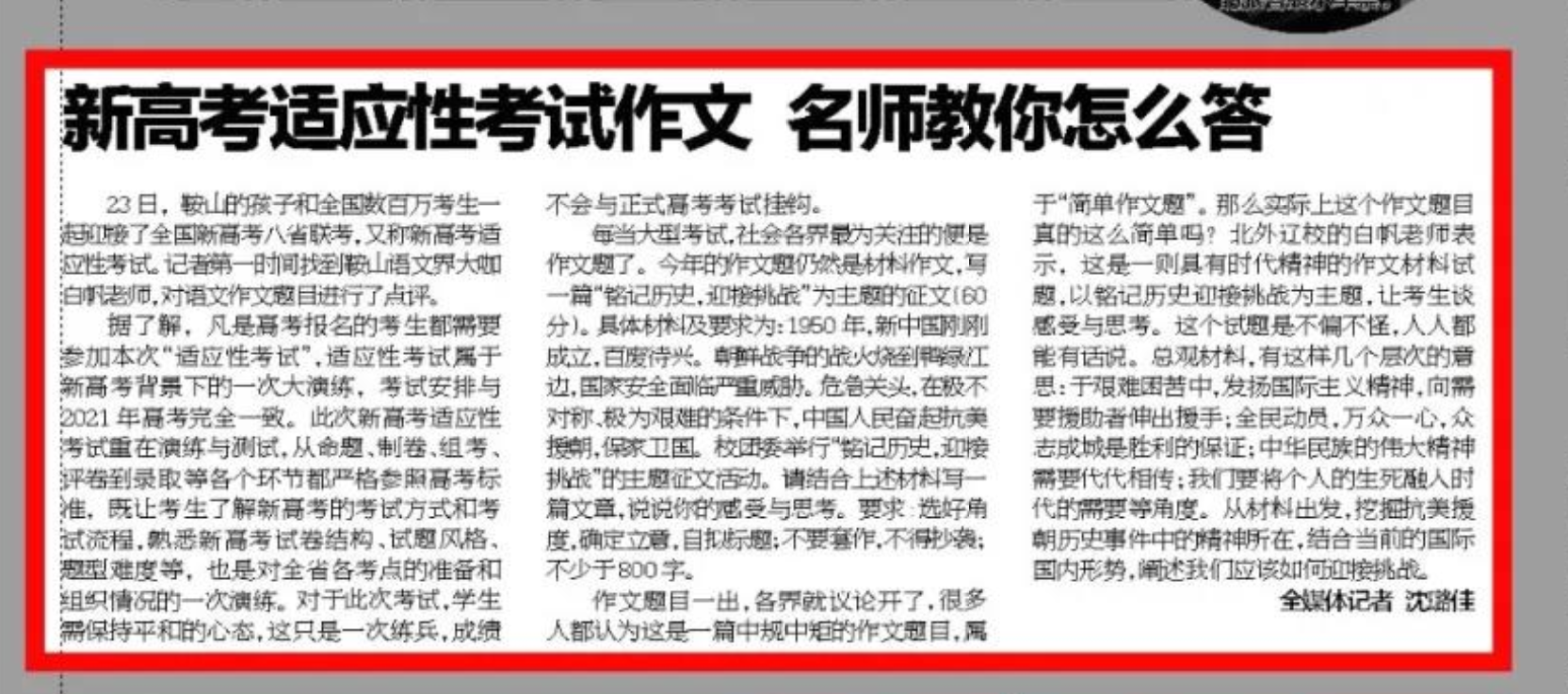 【媒体关注】权威解读 千山晚报邀请白帆解读新适应性考试作文 2021年1月23日,鞍山地区学生参加了新高考适应性考试。北外辽校高中部白帆老师受到千山晚报记者邀请,对此次考试的