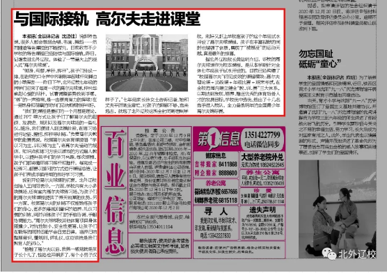 【媒体关注】千山晚报点赞北外辽校开设高尔夫球课 北外辽校特色课程与国际接轨,开设的浸入式高尔夫球课程受到了鞍山市新闻传媒中心关注、点赞。12月2日的鞍山日报、千山晚报、
