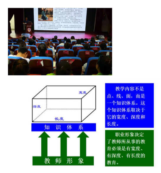 侯教授从做有宽度的教育、有深度的教育、有长度的教育三个维度对塑造教师自我形象展开论述。他认为:作为教师,只有用楷模的形象、以身作则才能做好学生的榜样。亲其师方能信其道,信其道更能亲其师,可见教师自我形象的重要性。教师既要提高内在修养,又要塑造外在形象,做内外兼修、德才双馨的教师。