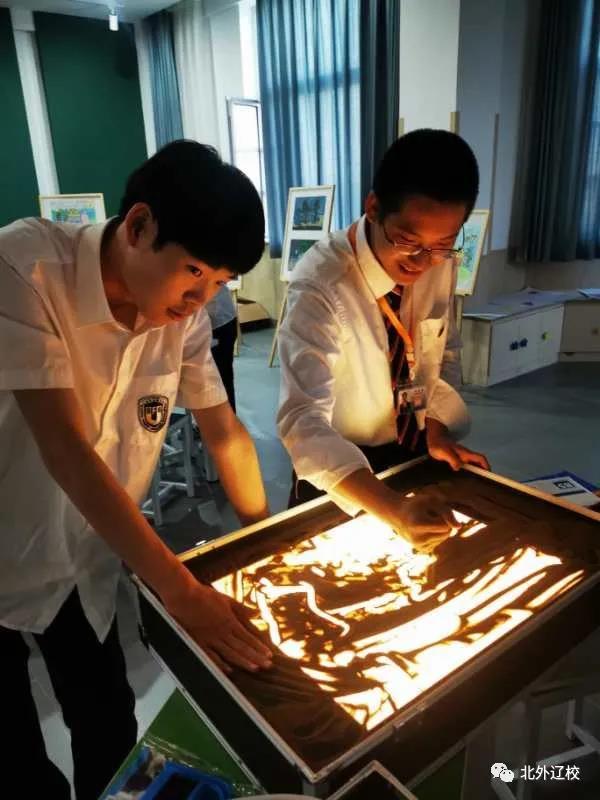 为全方位培养孩子,北外辽校开设沙画课程。在沙画课堂上,老师结合音乐、表演、文学等多种艺术形式,灵动又有很强的互动性,孩子们都特别喜欢。孩子们透过一粒粒流动的沙子感受“艺术的世界性”、“时间的流动性”、“美育的综合性”、“人生的随性与包容”,感悟做人的道理。通过沙画课堂,孩子们的审美教育在不知不觉中提升,美术艺术教育也在一粒粒流动的沙子中生根、发芽。