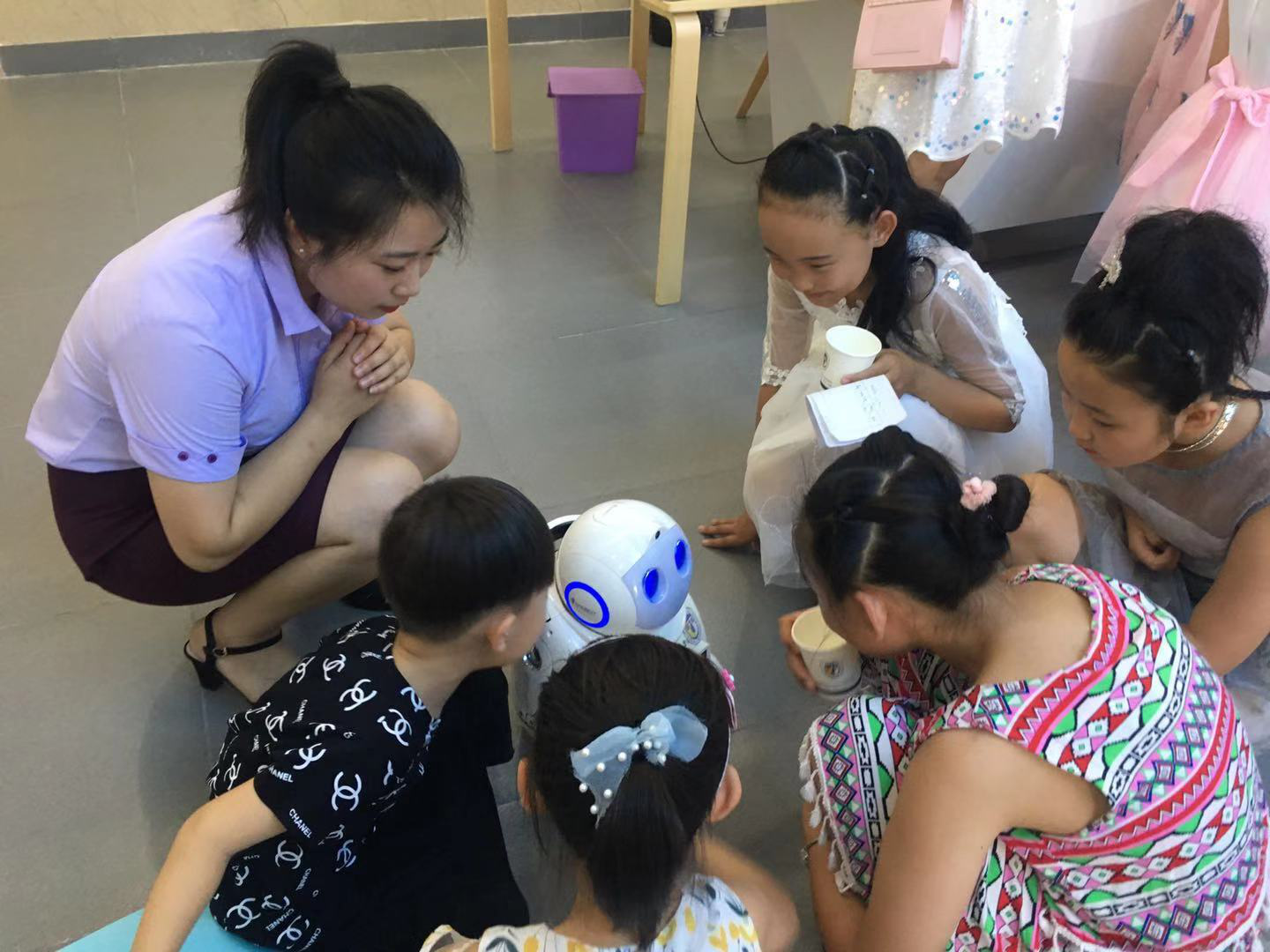 一群孩子被机器人迷住了,围着机器人叽叽喳喳聊个不停,非常兴奋!