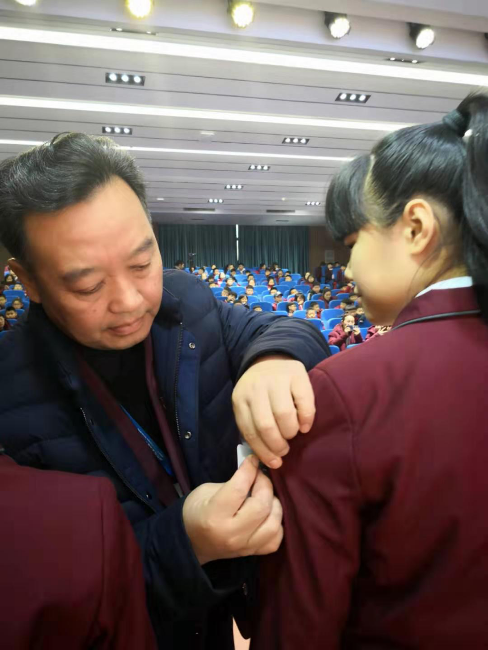 张校长为第一届大队委佩戴臂章。