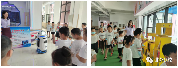 在北外辽校老师的带领下,路过了气模体育馆来到了教学区,在教学楼的创客教室,和机器人小胖进行了互动和对话。