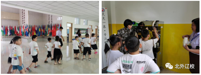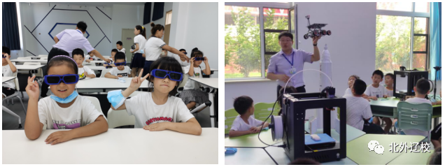 下课后在北外教师的带领下,参观并体验了学校里各种功能教室,在VR教室里带上3D眼睛探索了科学的奥秘,在创客教室听专业老师讲解了各种科学小实验的原理。