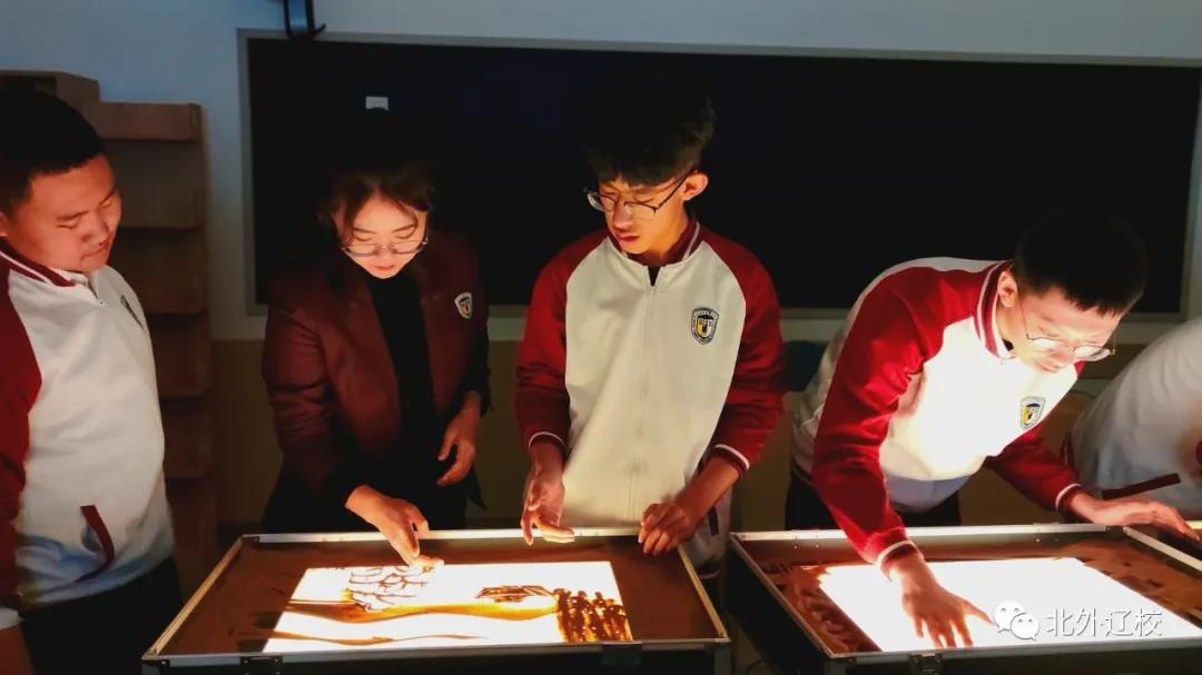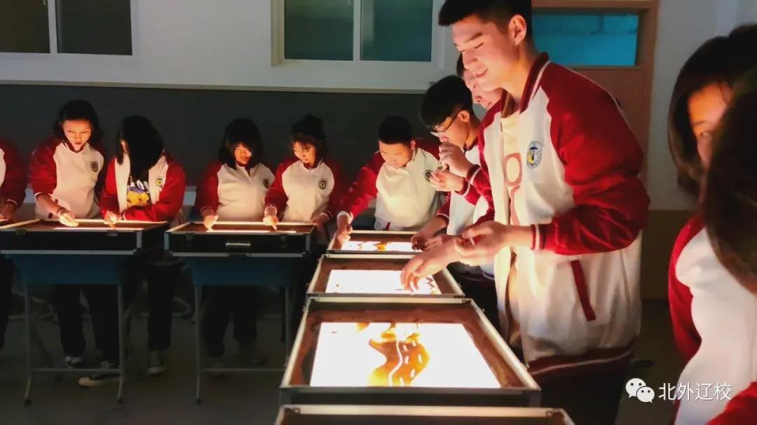 沙画作为一种新的艺术表现形式,高雅独特、瞬息万变,学生们在学习沙画时,可以释放学习压力、抒发情感,还能丰富想象力、创造力,开发大脑,增强艺术修养。近日,在北外辽校沙画课堂上,赵晋一老师融入家乡元素,带领学生们以沙画的方式再现家乡的大好风光。