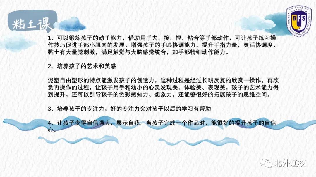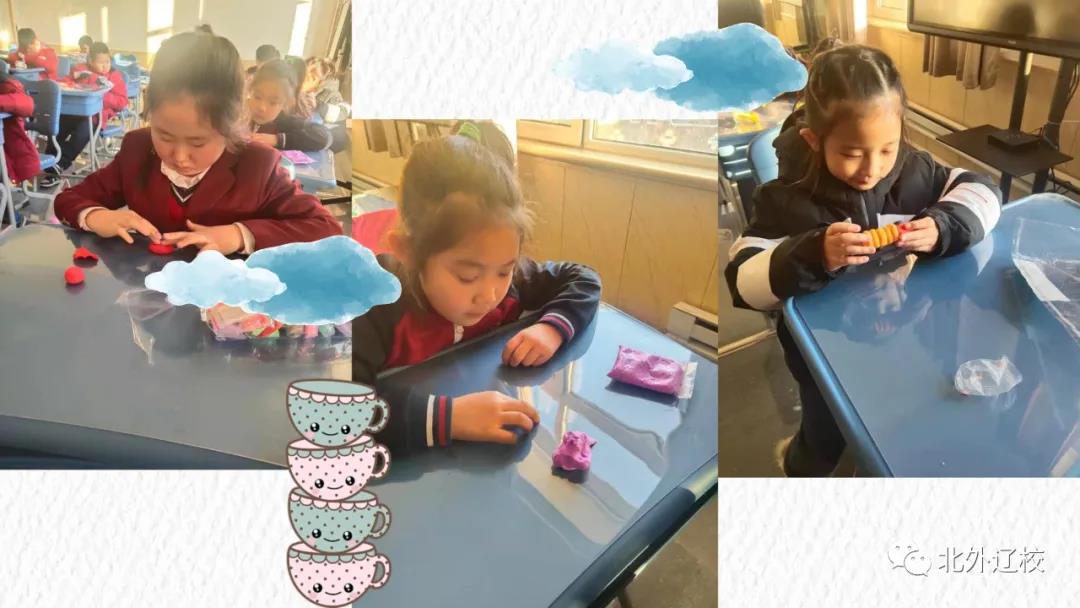 北外辽校开设的粘土课,不但可以锻炼学生的动手能力,还可以增强他们的手眼协调能力,并激发学生们的艺术创造力,帮助他们用手和眼,发现美、表现美、欣赏美,从而提升学生们的自信,让他们充分展现自我美好的年华。
