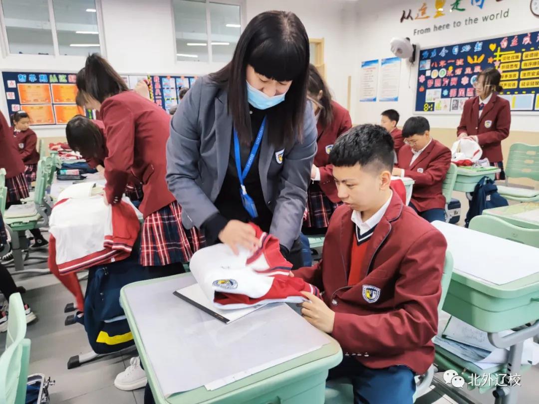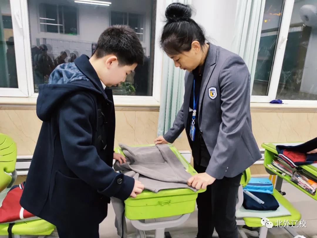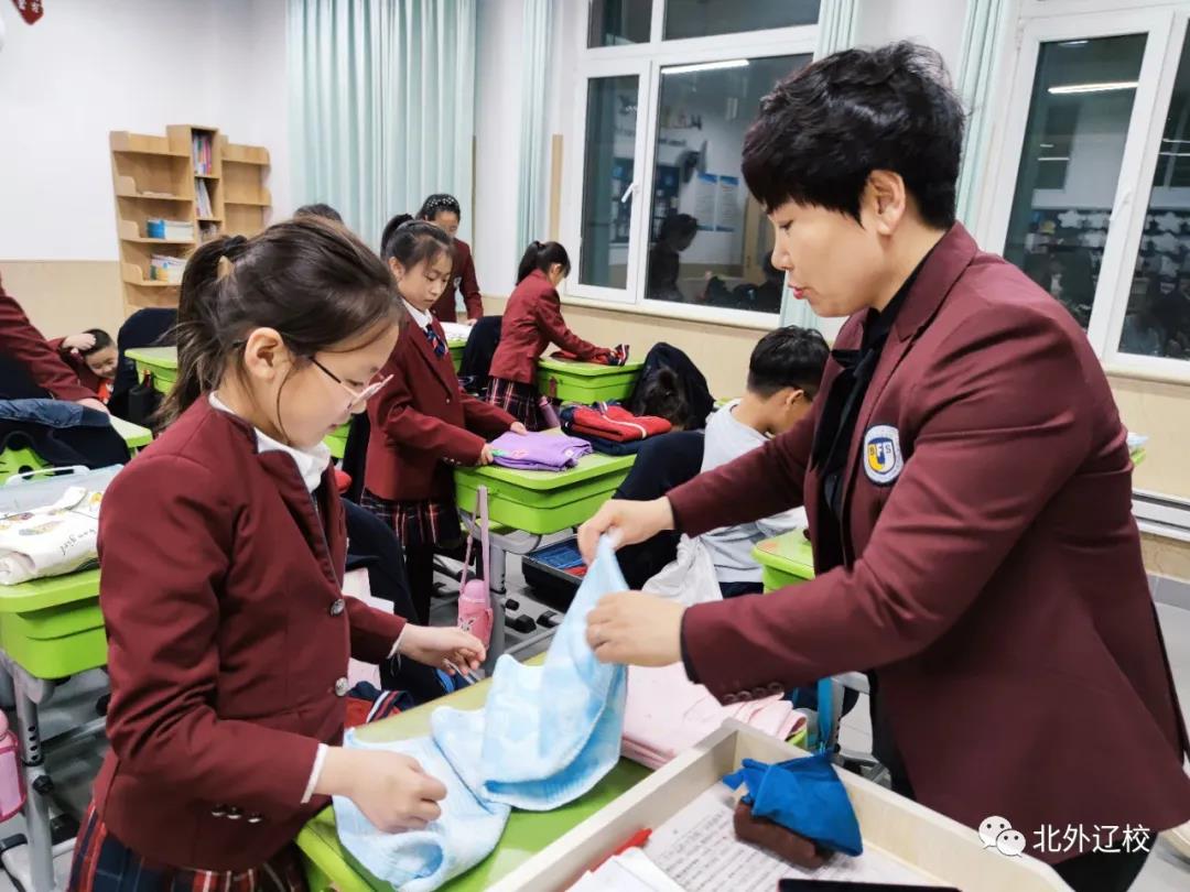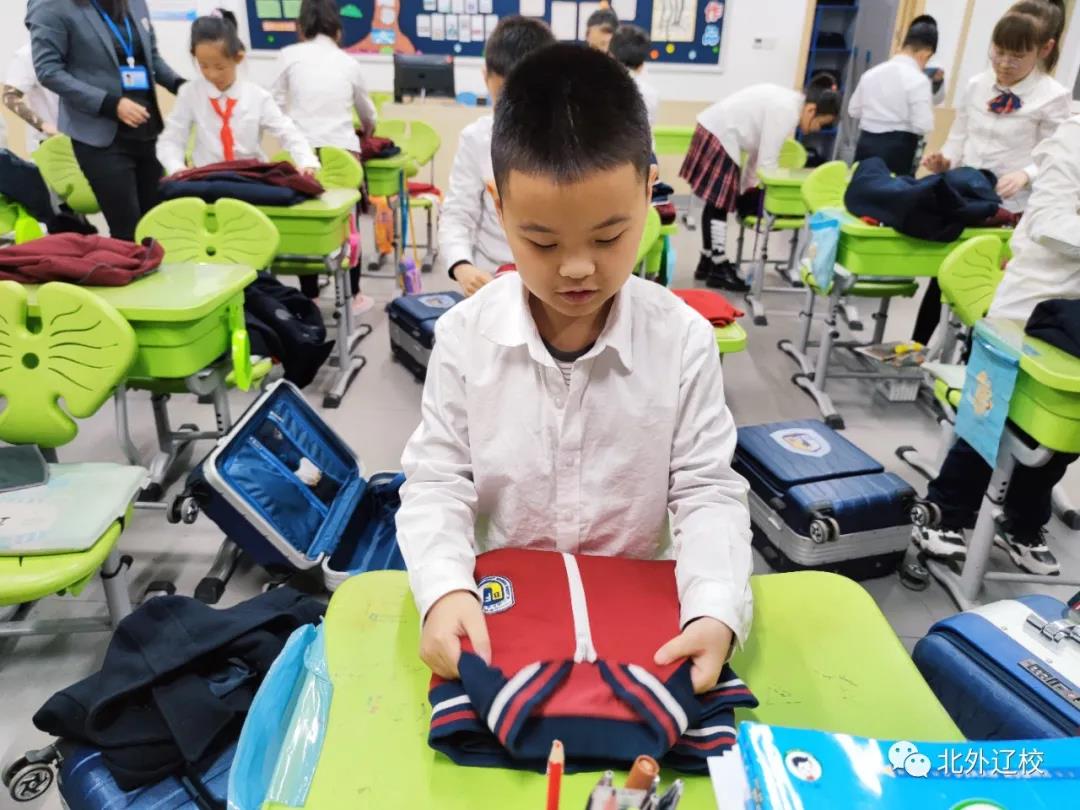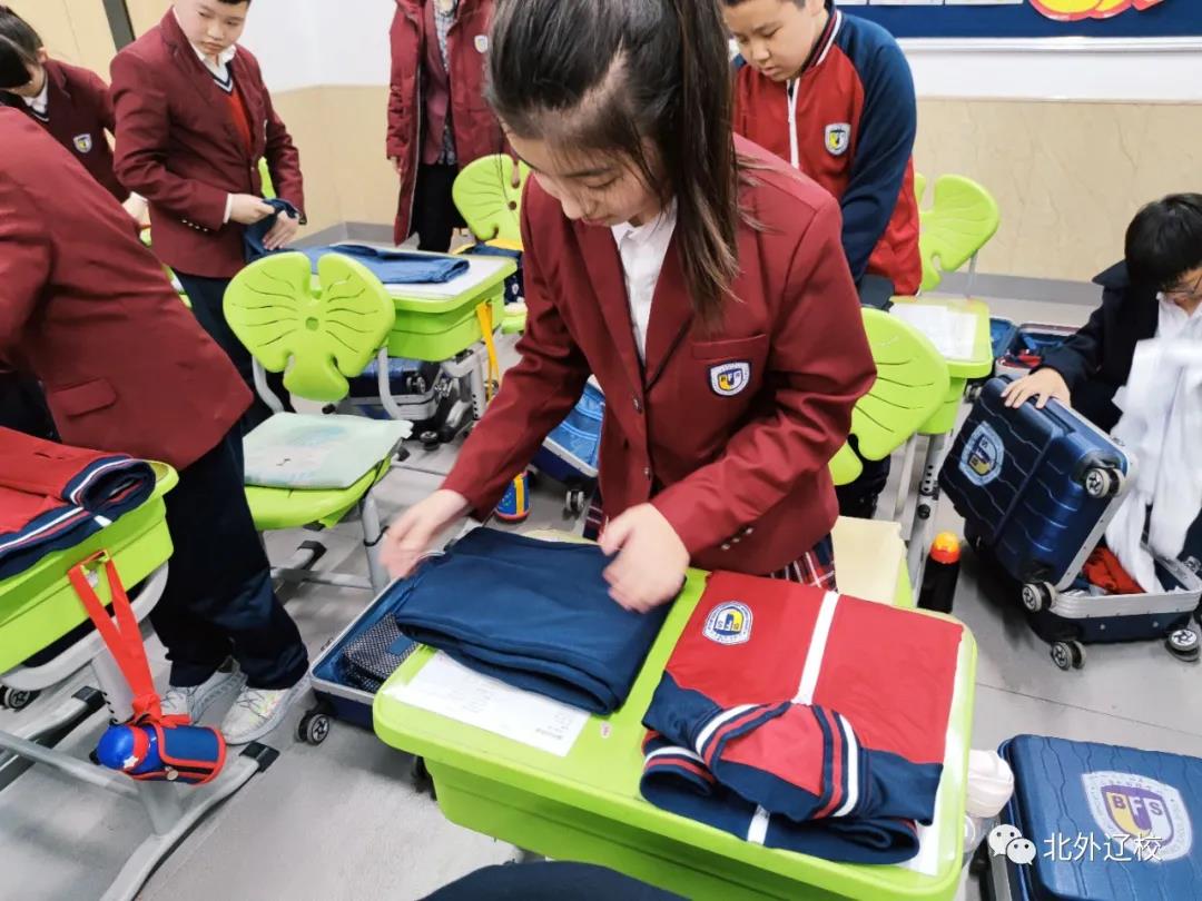 如何叠衣服、整理大衣,将裤子叠放整齐,怎样将衣物整齐地放在旅行箱里。为了让学生们直观地了解学习内务整理知识,由生活部老师示范,全媒体中心精心制作了指导视频,并发放到各个班级。在班主任和生活老师的指导下,学生们通过电子黑板观看内务整理指导视频,然后生活部老师在现场进行指导。